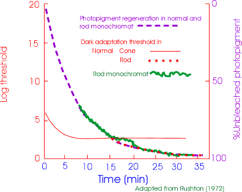 The early stage of the psychophysical function for rod threshold is not seen for a normally sighted person because the cone receptors are more sensitive than the rods. You can see, in this graph and also in the dark adaptation graph that the cone function reaches a plateau after about 7 minutes in the dark. Rod vision takes over when it becomes more sensitive. The significance of the graph on the right is that because the same retinal densitometry function for rods is found with a normal and rod monochromatic observer we can confidently assume that the extrapolation of the early stage of rod sensitivity shown in the dark adaptation curve is correct.