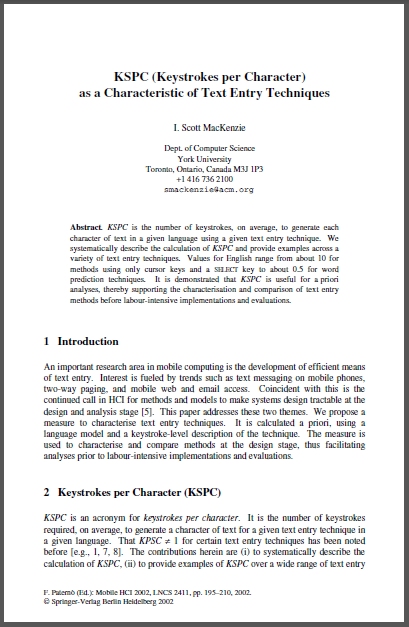 This is the download page for the software used to compute the statistics in KSPC (keystrokes per character) as a characteristic of text entry techniques, the paper by myself published in the proceedings of MobileHCI 2002. The software was written in Java. The download includes the source and class files as well as documentation explaining the operation and use of the software.To get started, just unzip the files into a directory and open