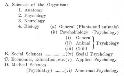 This historical sketch, though very brief, should make ear the reasons why the word "psychology" has had different meanings at different times, and also what it has come to mean at the present time. The place of psychology among the sciences will be most readily understood ~y considering the relations between the different sciences of man and society as they appear in the following table: [p. 10]