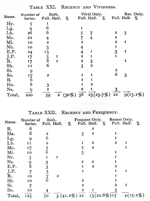 The comparison of freqruency with vividness shows far less inequality, and yet there is a definite excess of correct associations with frequency. In half the cases where there was any association at all, both the frequent and the vivid numeral were recalled. The records are these: