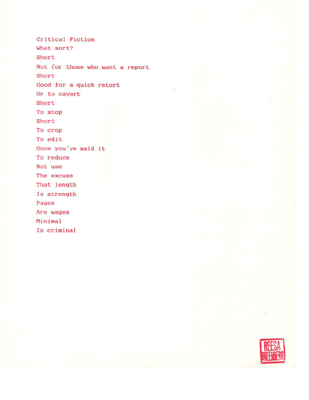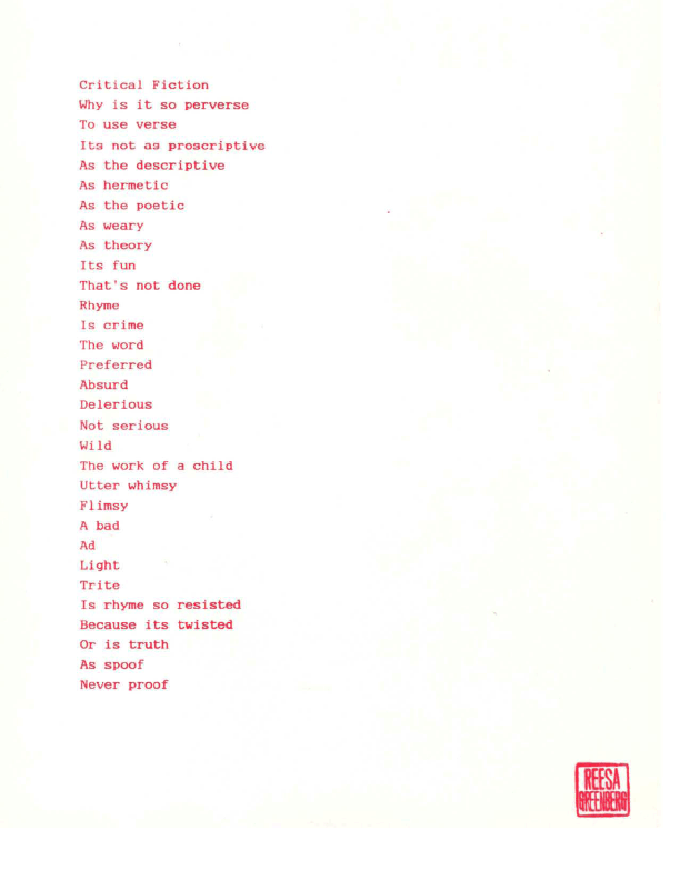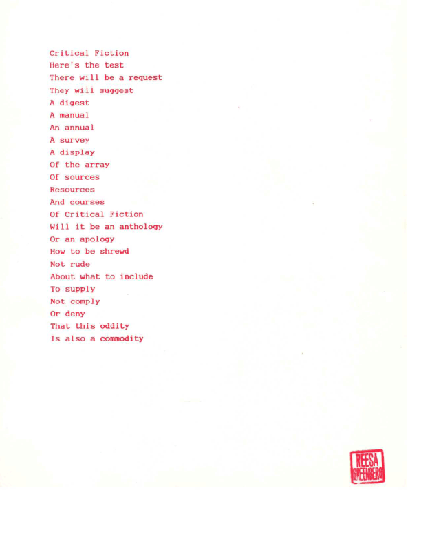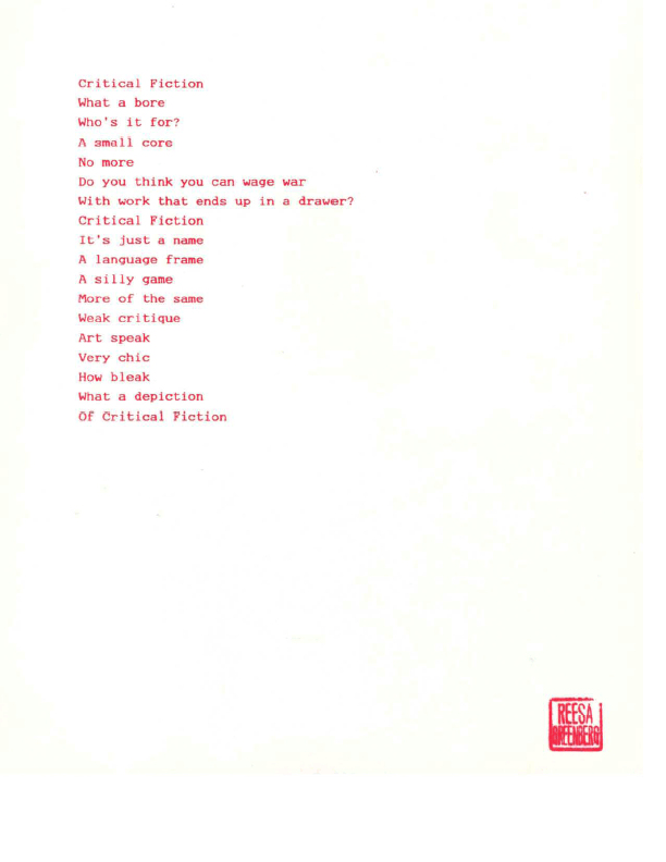 1989 "Critical Fictions" presented at the Banff Centre for the Arts (summer Writting Criticism workshop).