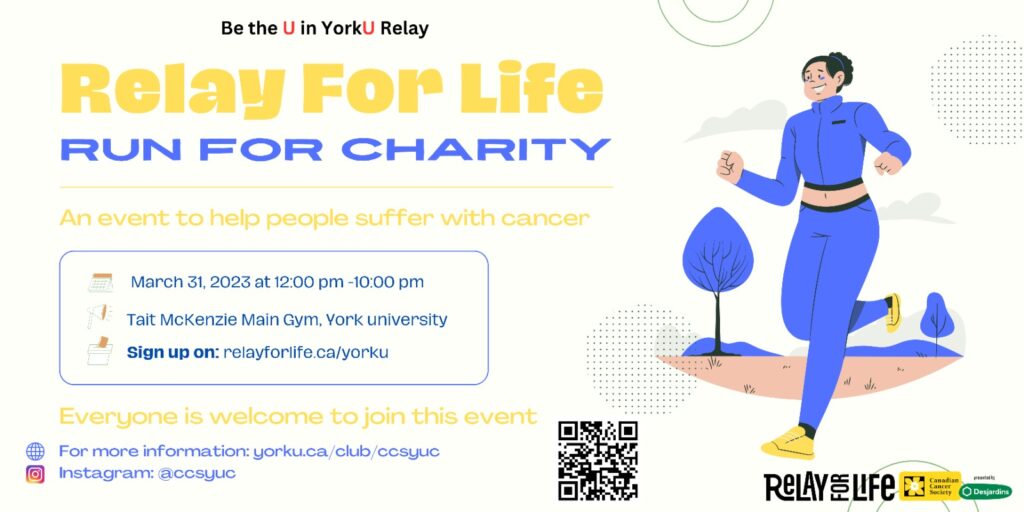Our organization is the Canadian Cancer Society York University Chapter (CCSYUC). We are a student-run club at York University affiliated with the Canadian Cancer Society, Canada’s largest national cancer charity that funds research, support services, advocacy programs and more. Our chapter is dedicated to raising awareness and funds for cancer research and support services, as well as to promoting healthy lifestyle choices and cancer prevention.