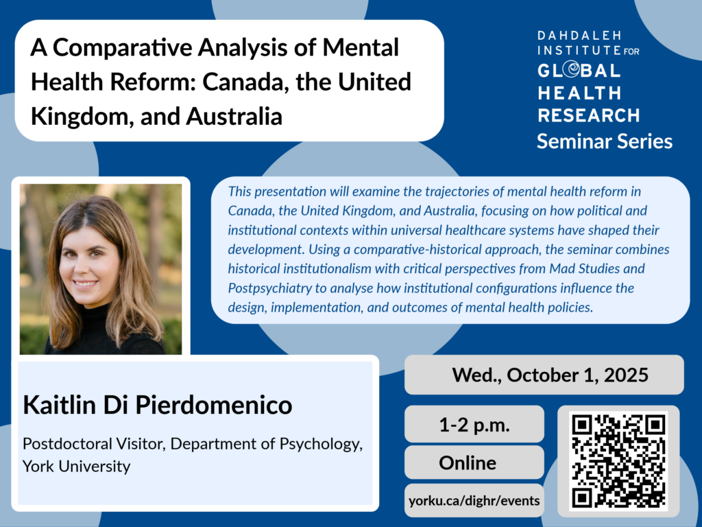 On October 1, 2025, Kaitlin Di Pierdomenico, a postdoctoral visitor in the Department of Psychology at York University presented her doctoral research on mental health reform. Her research centers around Canada, Australia and the UK and examining how a...