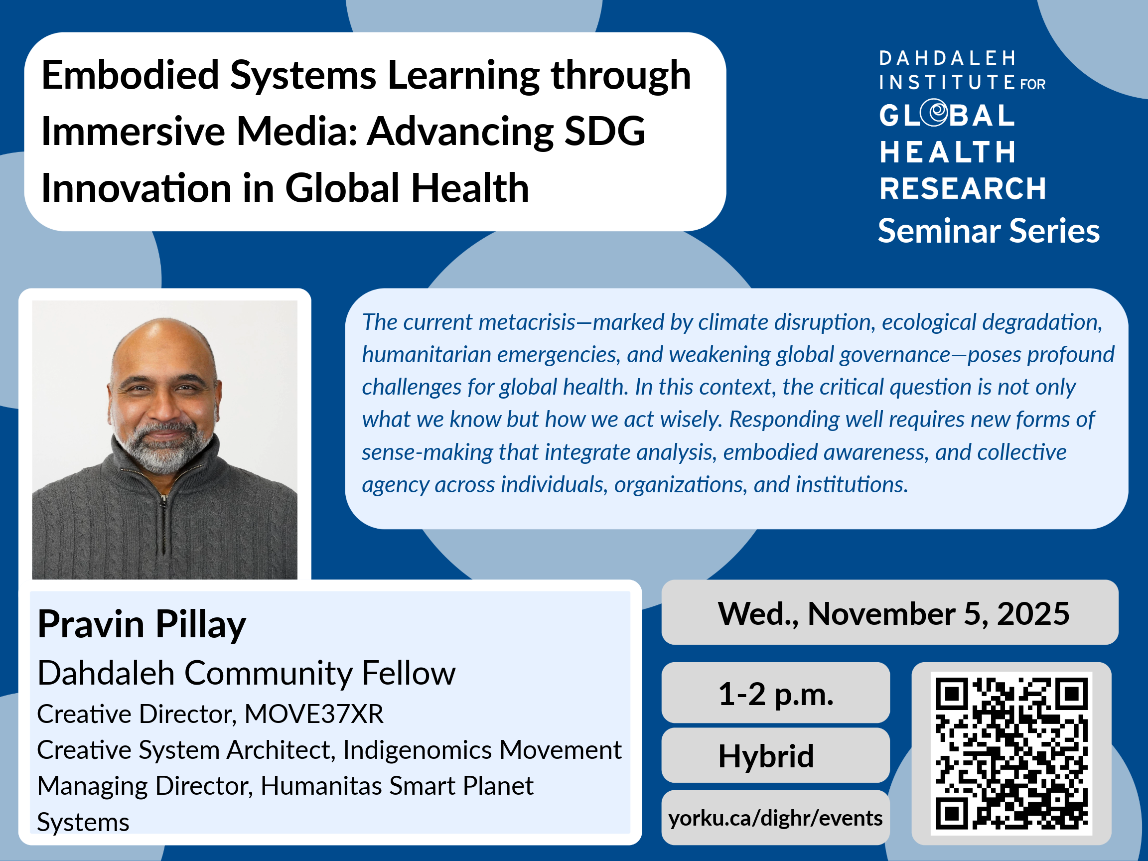 This one-hour seminar, led by Pravin Pillay, Creative Director of MOVE37XR, introduces the Dahdaleh Institute for Global Health Research (DIGHR) Community to experimental methods at the intersection of planetary health, humanitarianism, and foresighting. The session blends theory, immersive experience, and dialogue to consider how immersive media can inform global health scholarship and practice.