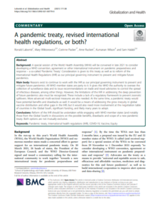 Labonté, R., Wiktorowicz, M., Packer, C. et al. (2021). A pandemic treaty, revised international health regulations, or both? Global Health, 17,128. https://doi.org/10.1186/s12992-021-00779-0