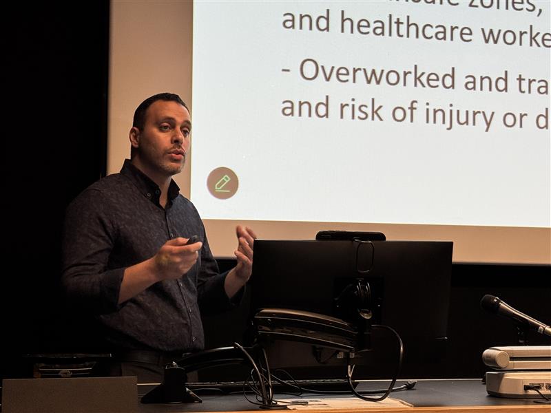 Dr. Ahmad Abu Shaban, Visiting Professor in the Faculty of Environmental & Urban Change and the Faculty of Liberal Arts & Professional Studies (LAPS) at York, and Associate Professor & Dean of the Faculty of Agriculture and Veterinary Medicine at Al Azhar University in Gaza, began his presentation by sharing the historical context of Palestinians’ dispossession from their land from 1947 to present-day. Dr. Abu Shaban stressed the importance of challenging the narrative that this genocide began in October 2023. Rather, generations of Palestinians have faced the targeted aggression of Israel.