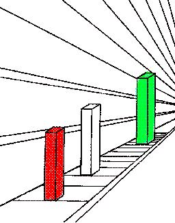 Take close look at the pattern on the floor, walls and ceiling. Can you see how they tend to converge on to a common point in the distance? This is called perspective. The further way objects are the smaller the visual angle they subtend on the retina. However, if you were actually standing in the hallway containing the blocks the floor pattern and those on the walls and ceiling would not seem to converge. Another example is when you stand in the middle of rail road tracks (beware of trains) the parallel tracks continue to appear parallel for a long way into the distance even though they project onto your retina in perspective.