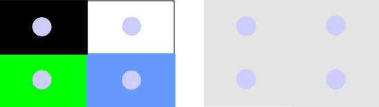The circular area in each quadrant in the left figure is exactly the same color. The different appearance is due to the surround and the lateral interactions that occur. On the right I merely changed the background colors so that they are all identical. You can now see that the circular areas are, indeed, identical.