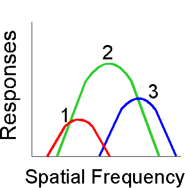 Hypothetical tuning curves for three spatial frequency channels.A.1. peak sensitivity of upper left grating ... 2. peak sensitivity of two right gratings ... 3. peak sensitivity of lower left grating