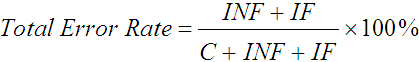 (10) If no errors are made, then INF and IF are both zero, resulting in a zero total error rate. If errors are made, they result in the same error rate regardless of whether they were corrected or not. Putting effort into correcting errors, transfers keystrokes from INF to IF, but does not affect the total error rate. In the previous example the total error rate would be (INF + IF) / (C + INF + IF) = 3 / 17 = 17.6%.