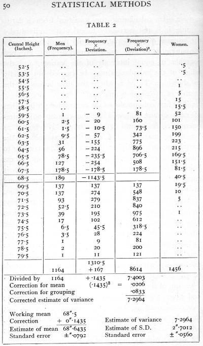 The first column shows the central height in inches of each group, followed by the corresponding frequencies. A central group (68.5") is chosen as "working mean." To form the next column the frequencies are multiplied by 1, 2, 3, etc., according to their distance from the working mean; this process being repeated to form the fourth column, which is summed from top to bottom in a single operation; in the third column, however, the upper portion, representing negative deviations, is summed separately, and subtracted from the sum of the lower portion. The difference, in this case positive, shows that the whole sample of 1164 individuals has in all 167 inches more than if every individual were 68.5" in height. This balance divided by 1164 gives the amount by which the mean of the sample exceeds 68.5". The mean of the sample is therefore 68.6435". The sum of the fourth column is also divided by 1164, and gives an uncorrected estimate of the variance; two corrections are then applied -- one is for the fact that the working mean differs from the true mean, and consists in subtracting the square of the difference ; the second, which is Sheppard's correction for grouping, [p. 50] [table] [p. 51] allows for the fact that the process of grouping tends somewhat to exaggerate the variance, since in each group the values with deviations smaller than the central value will generally be more numerous than the values with deviations larger than the central value. Working in units of grouping, this correction is easily applied by subtracting a constant quantity 1/12 (=.0833) from the variance. From the variance so corrected the standard deviation is obtained by taking the square root. This process may be carried through as an exercise with the distribution of female statures given in the same table (p. 103).