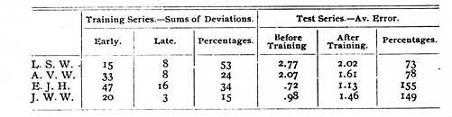 Subject W. before and after the training described on page 391 was tested with 12 objects, e.g., an envelope, a brush, a wrench, the average length being 5.8 inches. His sums of deviations were 5.0 and 5.0, being the same. The average error was 0.42 -- in both cases.