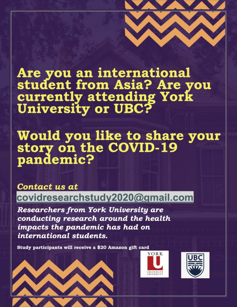 This project examines through focus group interviews how international students from Asia who are attending the University of British Columbia and York University are faring during COVID-19.