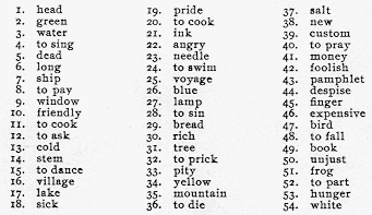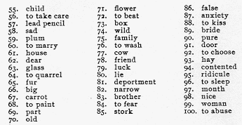 I then distributed these critical words among twice as many indifferent stimulus words in such a manner that each critical word was followed by two indifferent ones. As a rule it is well to follow up the critical words by indifferent words in order that the action of the first may be clearly distinguished. But one may also follow up one critical word by another, especially if one wishes to bring into relief the action of the second. Thus I placed together "darkish red" and "leather," and "chain" and "silver."
