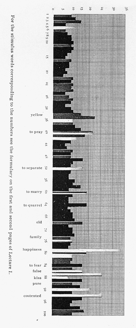 Besides the plaintiff and the guilty one, only the head nurse knew the exact particulars of the deed, for as soon as the former missed her money she immediately asked the head nurse to help her find it, thus the head nurse had been able to learn the smallest details, which naturally rendered the experiment still more difficult, for she was precisely the one most suspected. The conditions for the experiment were better for the others, since they knew nothing concerning the particulars of the deed, and some not even that a crime had been committed. As critical stimulus words I selected the name of the robbed nurse, plus the following words: cupboard, door, open, key, yesterday, banknote, gold, 70, 50, 20, money, watch, pocketbook, chain, silver, to hide, fur, dark reddish, leather, centimes, stencil, receipt, Dosenbach. Besides these words which referred directly to the deed, I took also the following, which had a special affective value: theft, to take, to steal, suspicion, blame, court, police, to lie, to fear, to discover, to arrest, innocent.