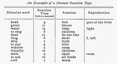 It has long been thought that the association experiment [p. 236] enables one to distinguish certain intellectual types. That is not the case. The experiment does not give us any particular insight into the purely intellectual, but rather only into the emotional processes. To be sure we can erect certain types of reaction; they are not, however, based on intellectual peculiarities, but depend entirely on the proportionate emotional state. Educated test persons usually show superficial and linguistically deep rooted associations, whereas the uneducated form more valuable associations and often of ingenious significance. This behavior would be paradoxical from an intellectual viewpoint. The meaningful associations of the uneducated are not really the product of intellectual thinking, but are simply the results of a special emotional state. The whole thing is more important to the uneducated, his emotion is greater and for that reason he pays more attention to the experiment than the educated person, and that is why his associations are more significant. Aside from the types determined by education we have to consider three principal individual types: