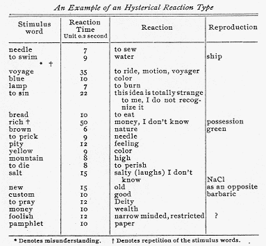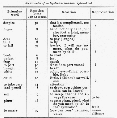 Let us in the first place continue the discussion concerning the prolonged reaction time. It often happens that the test person actually does not know what to answer to the stimulus [p. 227] word. The test person waives any reaction; for the moment he totally fails to obey the original instructions, and shows himself incapable of adapting himself to the experimenter. If this phenomenon occurs frequently in an experiment it signifies a higher degree of disturbance in adjustment. I call attention to the fact that it is quite indifferent what reason the test person gives for the refusal. Some find that too many ideas suddenly occur to them, others, that not enough ideas come to their minds. In most cases, however, the difficulties first perceived are so deterrent that they actually give up the whole reaction. The following example shows a case of hysteria with many failures of reaction: