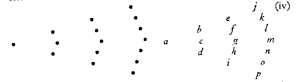 Resembling (i) but still more compelling is the row of three-dot groupings given in (v). One sees abc/def, and not some other (theoretically possible) arrangement.